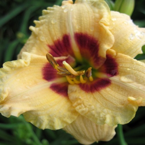 Миниатюрный. Красивый, нежно-абрикосовый, с винным глазом вокруг зеленоватого горла.