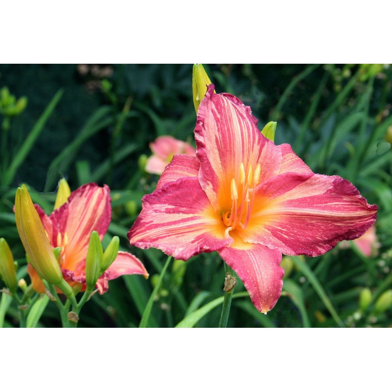 Цветки диаметром 17 см, пурпурно-розовые с кремово-розовыми полосками и золотисто-оранжевым горлом.
