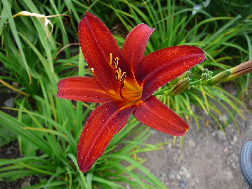 Цветки диаметром 12 см, красные с золотистым горлом. Сорт устойчив к засухе.